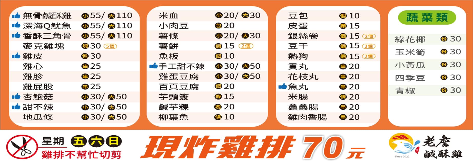 - 2020年9月再次開幕,決定再拼一次,卻少了老天眷顧,迎接而來的疫情大規模擴散,政府防疫升三級警戒,再一次影響生意,面對的是失落與壓力。某天收完店回到家,看著年邁的父親,在三合院口,挑著月光,修理著丟掉的炸網勺,看著陪伴我一路走過來的夥伴,我更加堅定了走下去的信念,調整腳步、調整心態,在這條炸物人生上,用雙手炸出屬於自己的彩虹
